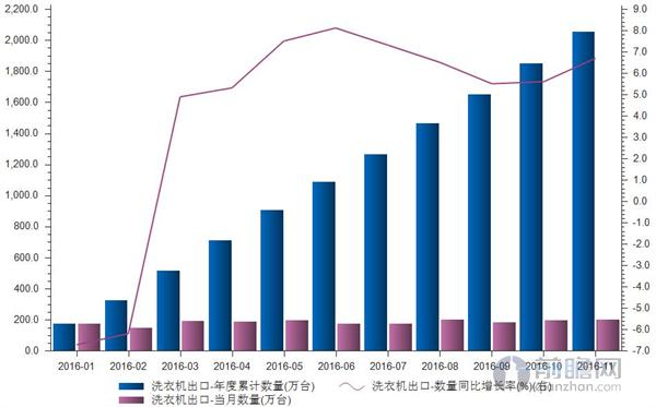 據(jù)前瞻數(shù)據(jù)庫(kù)數(shù)據(jù)顯示,2016年1-11月,我國(guó)洗滌機(jī)械出口量累計(jì)2055萬(wàn)臺(tái),同比增長(zhǎng)6.7個(gè)百分點(diǎn),出口金額30.38億美元,同比下滑6.2個(gè)百分點(diǎn),出口量呈現(xiàn)增長(zhǎng),而出口額卻表現(xiàn)下滑,顯示產(chǎn)品出口均價(jià)有所下滑,出口均價(jià)為147.84美元/臺(tái),價(jià)格同比下降12.05%。